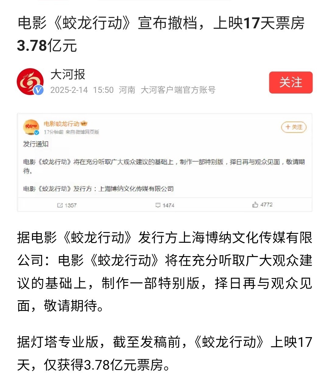 在《哪吒2》票房破百亿的时候,《蛟龙行动》官微发了一条祝贺信息,在那时,他们心里应该是满满的羡慕吧。