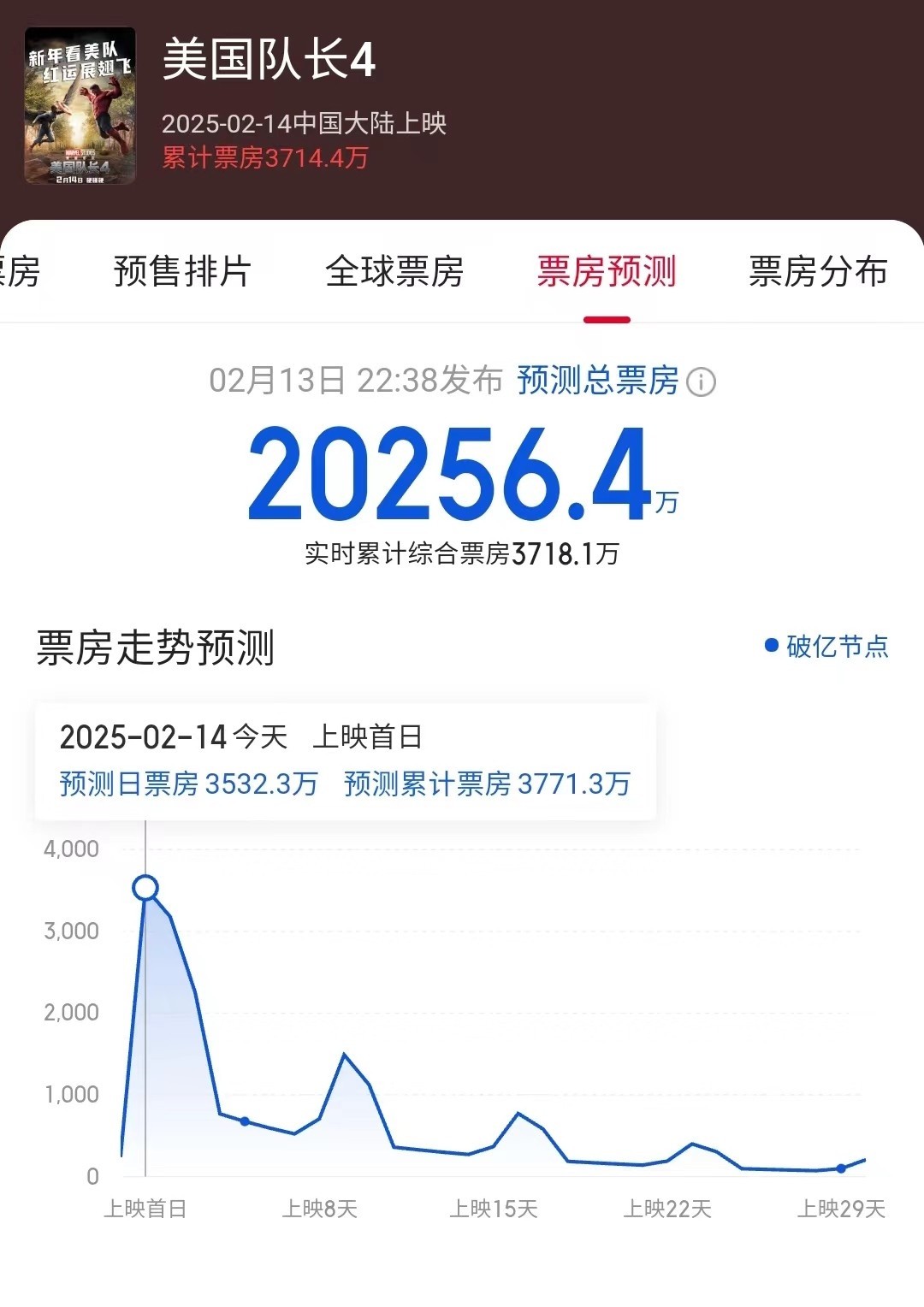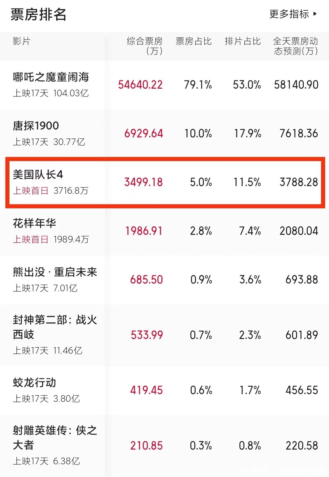 但美队在今天的首映礼上的表现并不佳,3000多万的票房连及格都算不上,就连猫眼对其最终的票房预测也仅仅只有2亿出头,这还不到被他视为对手的《哪吒2》半天的收入。